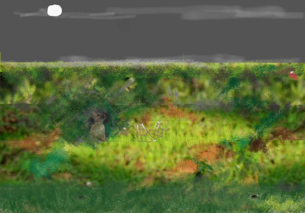 Nougat s’installe au bas de la pente afin d’observer l’approche des lapines.